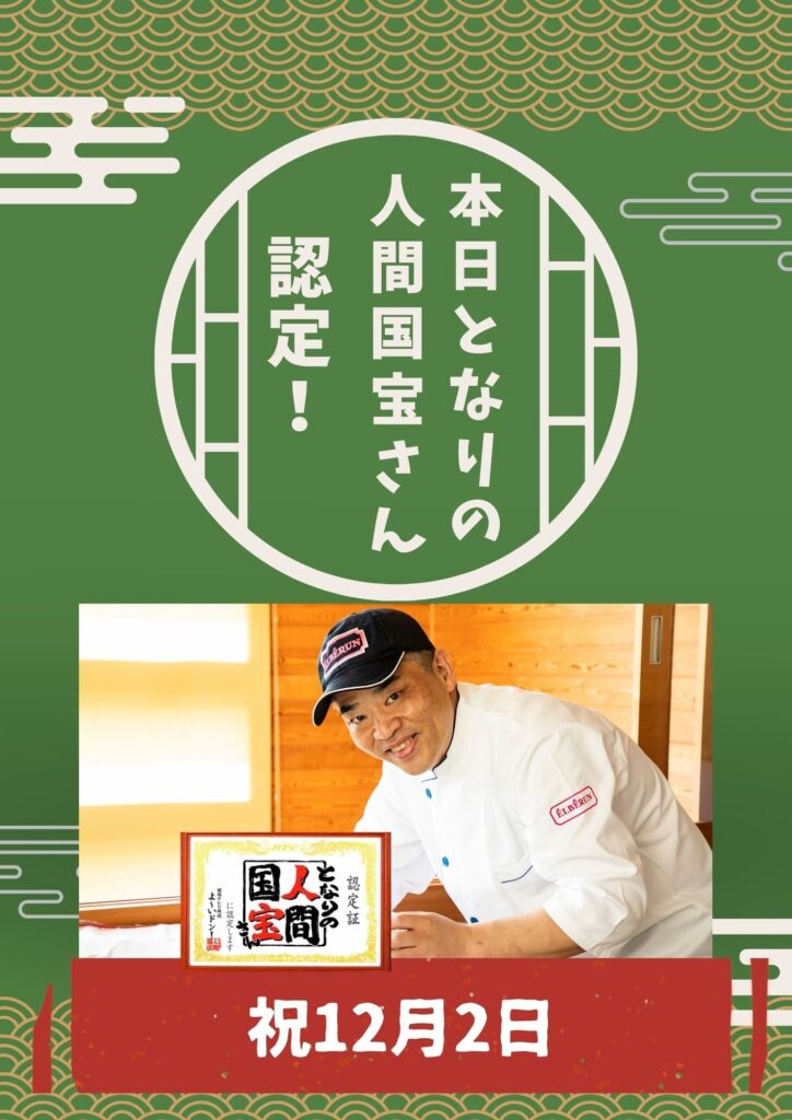 本日12月2日(火)、関西テレビ「よ~いドン!」にてとなりの人間国宝さんに認定されました㊗️🎊