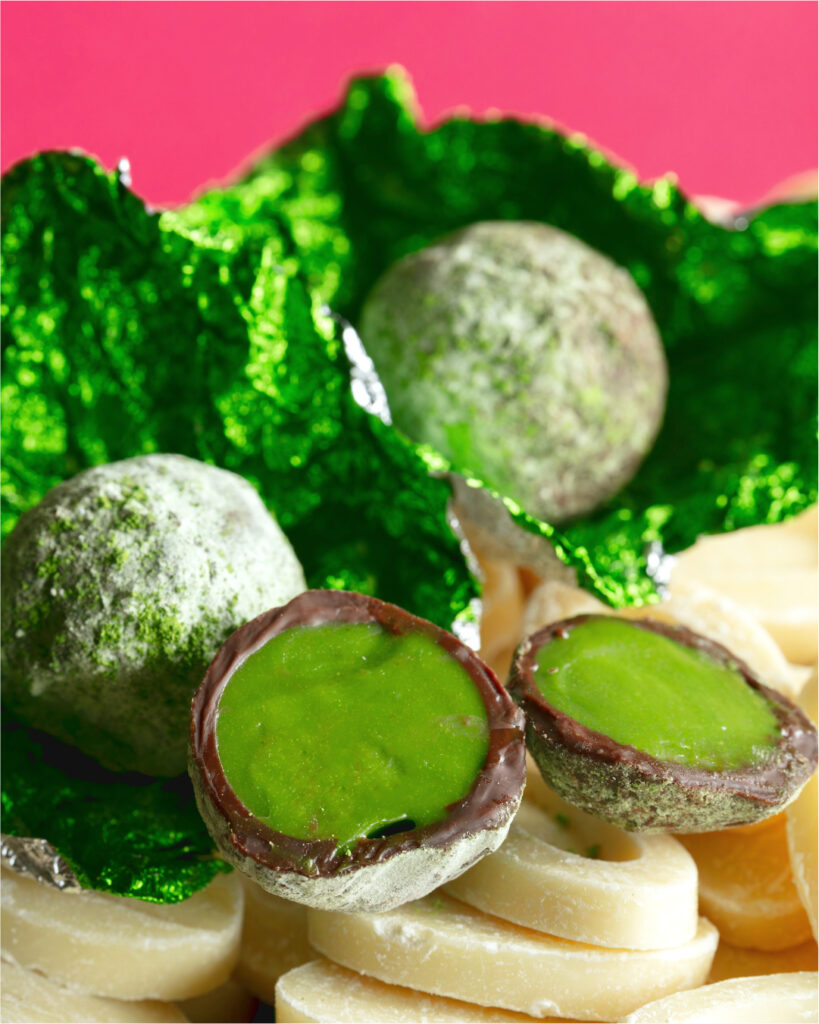 抹茶・松の白:ビターチョコレート&抹茶入り粉糖仕上げ(断面)
